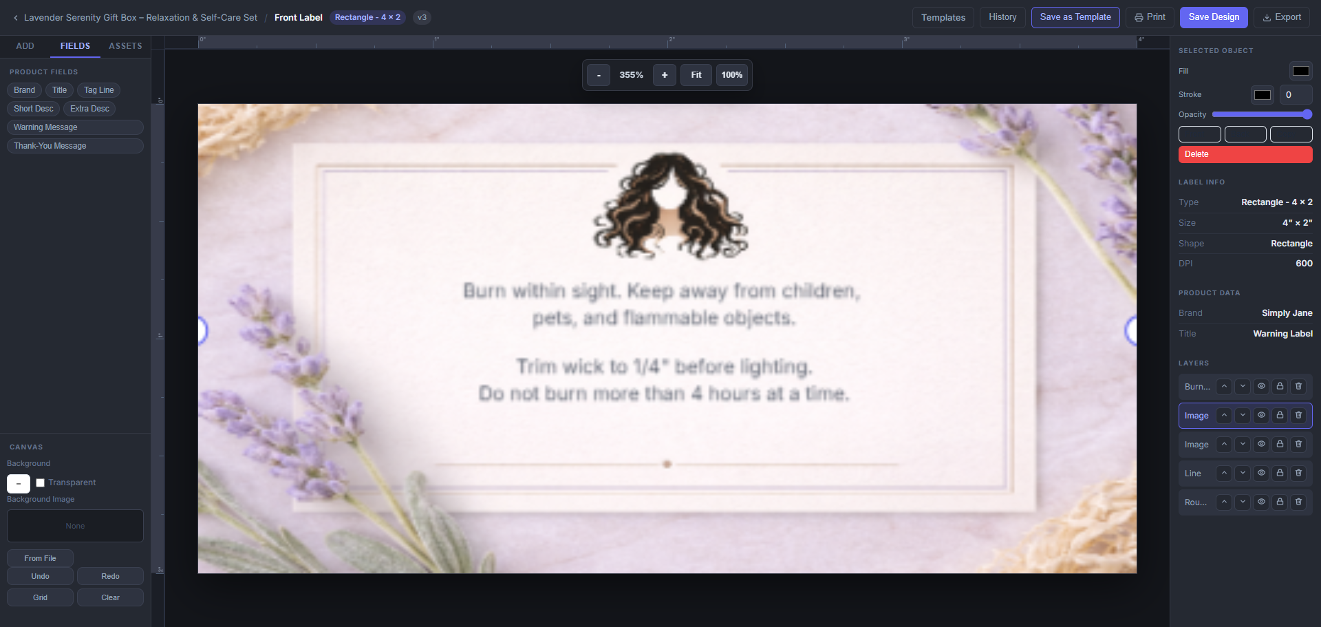 Each product stores its own front labels, warning labels, nutrition labels, ingredient labels, thank-you cards, and saved templates.